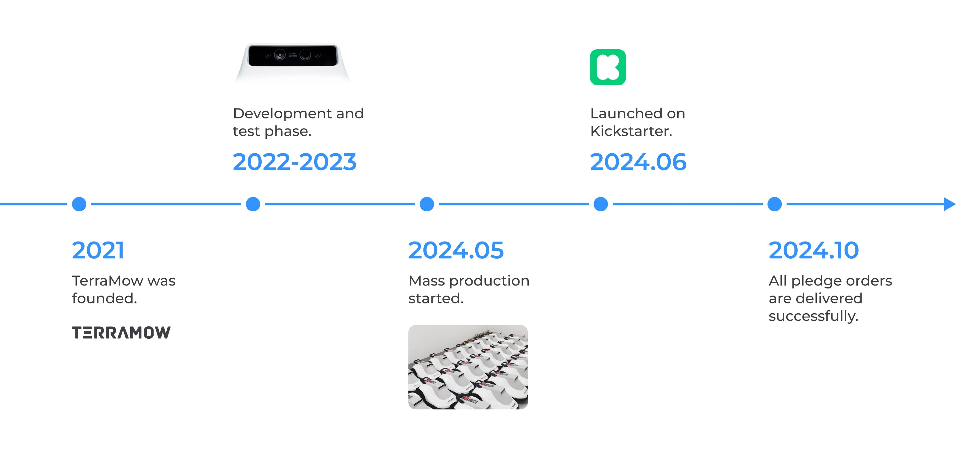 Il nostro viaggio è iniziato con il lancio di TerraMow, il robot rasaerba innovativo senza fili con visione AI. Dopo una campagna Kickstarter di enorme successo, TerraMow ha ottenuto ampi consensi dagli utenti di tutto il mondo.