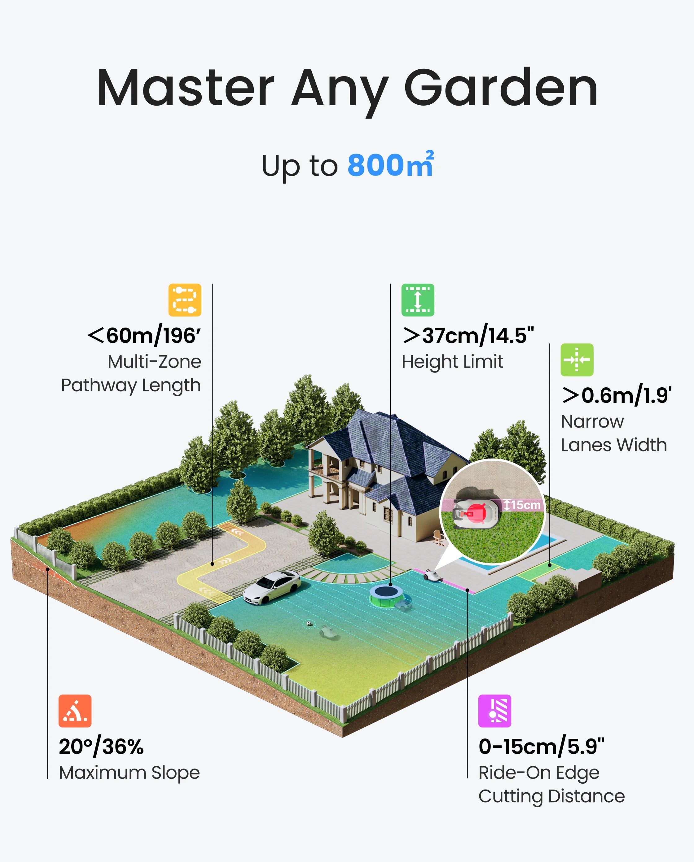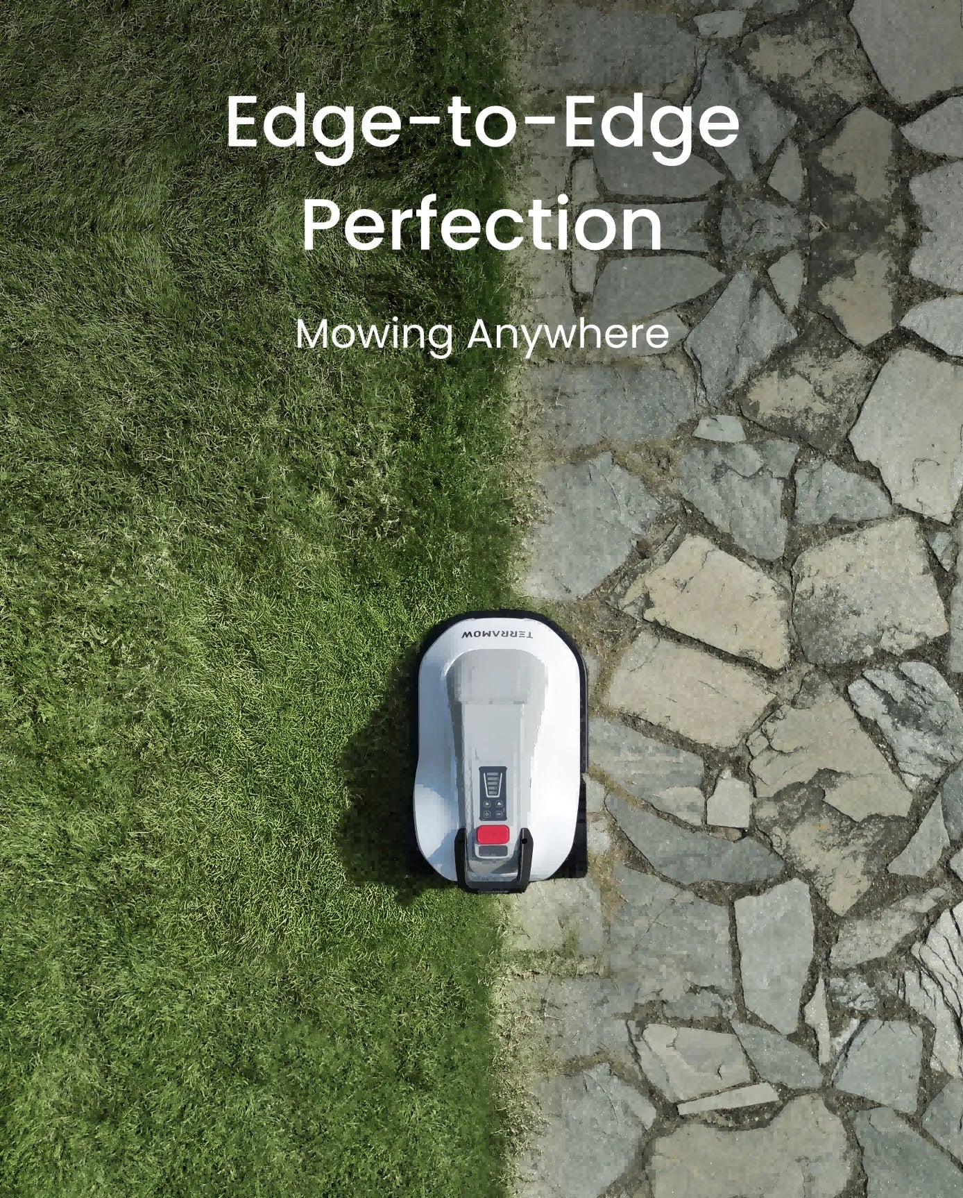 TerraMow è la soluzione perfetta per giardini complessi. Pianificando percorsi ottimali ed evitando ostacoli 3D in tempo reale, offre risultati di taglio eccezionali anche in prati pieni di aiuole, bordi non pavimentati, cespugli e sotto gli alberi. La sua agilità gli consente di navigare attraverso passaggi stretti fino a 60 cm di larghezza.